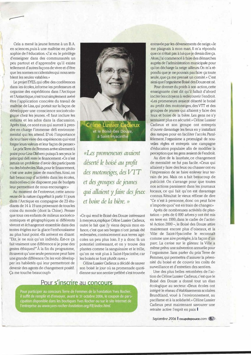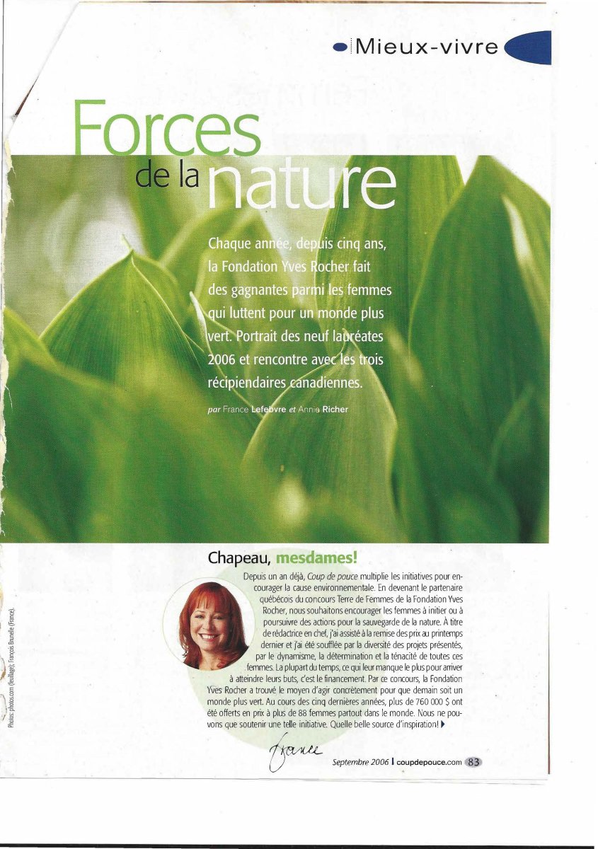 2006 Prix Terre de Femmes de la Fondation Yves-Rocher (2006). 2e prix canadien. Ce concours récompense les femmes qui protègent et mettent en valeur la nature pour le bien-être de tous.
